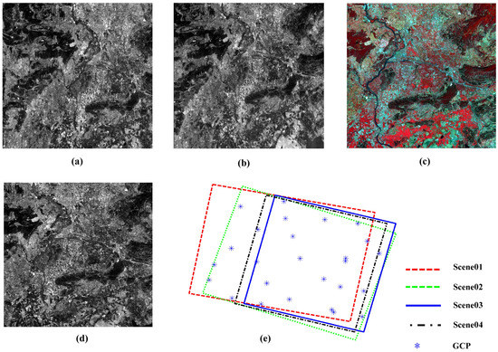 Four SPOT-5 images and the overlapping area : (a) Scene 01; (b) Scene 02; (c) Scene 03; (d) Scene 04; (e) The extents of four images and the distribution of GCPs.