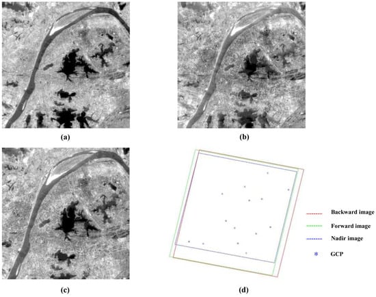 Three ZY-3 images and the distribution of ground truth points: (a) Backward; (b) Forward; (c) Nadir; (d) The extents of three images and the distribution of GCPs.