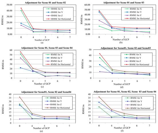 Result of conventional image positioning with different numbers of GCPs using SPOT-5 images: (a) accuracy of adjustment for Scenes 01 and 02 with different number of GCPs; (b) accuracy of adjustment for Scenes 01 and 03 with different number of GCPs; (c) accuracy of adjustment for Scenes 01, 03 and 04 with different number of GCPs; (d) accuracy of adjustment for Scenes 01, 02 and 03 with different number of GCPs; (e) accuracy of adjustment for Scenes 01, 02 and 04 with different number of GCPs; (f) accuracy of adjustment for Scenes 01–04 with different number of GCPs.