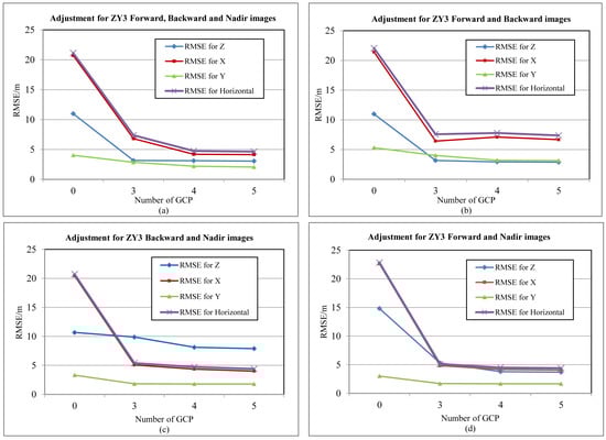 Result of conventional image positioning with different numbers of GCPs using ZY-3 images: (a) accuracy of adjustment for forward, nadir and backward images with different number of GCPs; (b) accuracy of adjustment for backward and forward images with different number of GCPs; (c) accuracy of adjustment for backward and nadir images with different number of GCPs; (d) accuracy of adjustment for forward and nadir images with different number of GCPs.