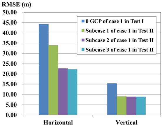 Subcases 2 and 3 perform best among the three subcases, in which the horizontal and vertical accuracy was about 22 m and 9 m, respectively, 11 m better than Subcase 1 for the horizontal accuracy, shown in Figure 5, because oriented Scene 04 has a higher spatial resolution than Scene 03, resulting in a better point measured precision. They have approximate vertical accuracy due to the same base-height ratio.