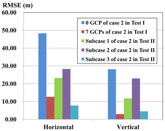 The horizontal accuracy has also an improvement of above 10 m for these three subcases compared with Cases 4, 5 and 6 in Test I (Figure 5d–f), because oriented images have accurate orientation parameters, lines of sight from which are close to the true position. Intersection of all of the lines of sight could be approximate to the true location while combining adjustment.