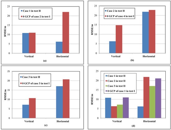 Accuracy Comparison between Case 2 of Test II and Test I with ZY-3 images: (a) accuracy comparison of Case 1 in Test II with Case 2 in Test I without GCPs; (b) accuracy comparison of Case 2 in Test II with Case 4 in Test I without GCPs; (c) accuracy comparison of Case 3 in Test II with Case 3 in Test I without GCPs (d) accuracy comparison of three cases in Test II with Case 1 in Test I without GCPs.