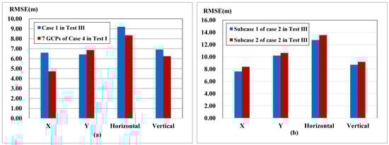 Accuracy of Test III: (a) accuracy comparison between Case 1 in Test III and Case 4 in Test I with seven GCPs; (b) accuracy comparison between Subcase 1 and Subcase 2 of Case 2 in Test III.