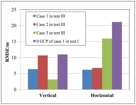 In Case 2, the oriented backward image is introduced into the adjustment with the new pairs of forward and nadir images. The vertical accuracy reaches 6 m, 8.51 m better than Case 4 of Test I (Figure 6d) without GCPs owing to the increase of base-height ratio, shown in Figure 9b. The horizontal accuracy has a small improvement of 0.95 m due to the increase of redundant observation.