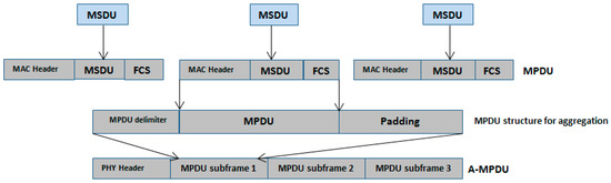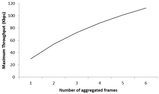 Considering the maximum packet size capacity 127 bytes and the size of single A-MPDU from Equations (5) and (6), we aggregate the maximum six MPDU in an A-MPDU. Therefore, the size of the maximum A-MPDU is: