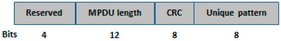 Figure 5 presents the design of the frame aggregation mechanism at the MAC layer. Initially, the data is received in the form of MSDUs. After applying the MAC headers, it becomes MPDU and ready for the physical layer. The combination of multiple MPDUs creates aggregated MPDU (A-MPDU). A-MPDU is generated before passing to the PHY layer for final transmission. The MAC does not wait for a certain number of MPDUs to create A-MPDU, so if a node gets a channel access the MAC takes available MPDUs to make A-MPDU for transmission. The destination of the all MPDUs must be same. The maximum size for an A-MPDU frame must not exceed than 127 bytes. Each encapsulated MPDU consists of a delimiter at the start and padding bits at the end. The purpose of the delimiter is to define a separation pattern of individual MPDU in A-MPDU. The delimiter represents the information including MPDU length, reserved bits (first four bits for future use), cyclic redundancy checks (CRC) and unique pattern. MPDU Length field represents the length of the MPDU. CRC design uses reserved and MPDU length fields for its calculation. The unique pattern is helpful to find the next delimiter. Figure 6 presents the delimiter structure.