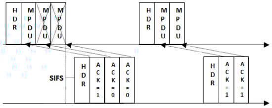 The block acknowledgement mechanism is widely used with IEEE 802.11n to support the frame aggregation mechanism. The IEEE 802.15.4 already gives the option to use a block acknowledgement [37]. The A-MPDU are capable of enhancing channel access performance significantly; however, in the wireless environment, the chances of frame error get high by increasing the frame size. Moreover, if the bit-error-rate (BER) is high then the probability of packet loss rate is also high which will cause high retransmissions. To resolve this issue, the block acknowledgement mechanism is used to support the A-MPDU frame. The receiving node receives the A-MPDU and only sends a collective acknowledgement against those MPDUs which are received correctly. The sending node will only retransmit the specific MPDU. The use of block acknowledgement mechanism supports the frame aggregation mechanism in high BER environment. Figure 7 shows an example of a block acknowledgement mechanism.
