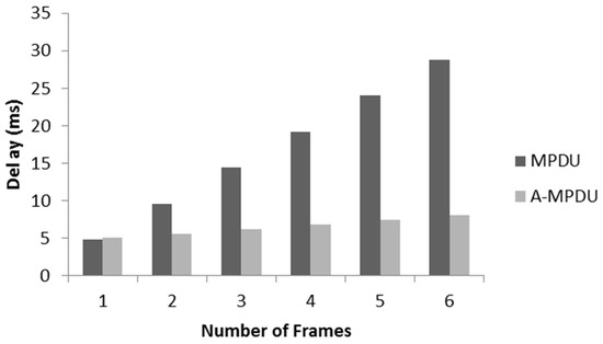 Using Equation (12) with ideal channel conditions, Figure 8 presents a comparative analysis of total delay for the transmission of the number of frames with aggregation and without aggregation. It is noted that without aggregation, delay continuously increases as every frame takes a separate channel access attempt and its overheads. We assume that a node gets channel access attempt at the transmission time. On the other hand, for the A-MPDU, a node sends multiple packets in single channel access attempt, only the packet size varies by increasing the frame aggregation size. It can be concluded that if there is a need to send 6 frames, an A-MPDU can sent it in one channel access with a minimum delay as in the cost of one frame it is sending five more frames. In contrast, the MPDU takes at least six channel attempts and the delay is significantly high. We also incorporate this analysis in our simulations.