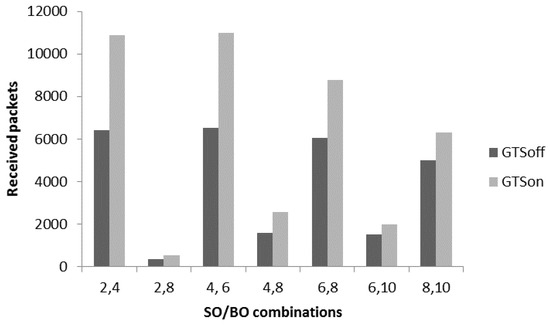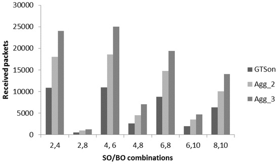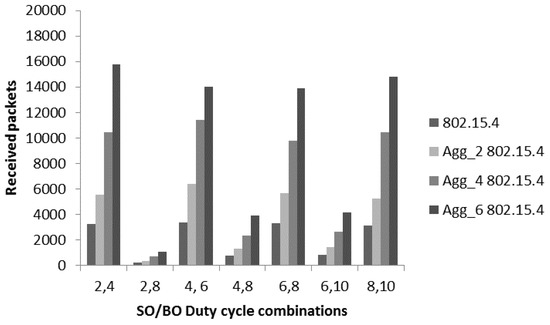 The beacon order (BO) represents the total duration of superframe including active and inactive periods. Therefore, different combinations of the duty cycle are considered including 2/4 (25%), 2/8 (2%), 4/6 (25%), 4/8 (6.25%), 6/8 (25%), 6/10 (6.25%) and 8/10 (25%). The value 25% means that a node stays awake for 25% in the superframe duration. In all combinations, we set SO = 2 or more than 2 to achieve the appropriate superframe duration as derived in Section 3. Moreover, we also used a variety of SO values like 2, 4, 6 and 8 to see the optimal results as the superframe duration is an important aspect for throughput provision. In Figure 10, we considered slotted CSMA/CA mode of CAP period with different combination of duty cycle and evaluated the number of received packets with and without aggregation mechanisms. Initially, DC with values 25% shows the higher number of received packets is near 3000. It is obvious that data generation is high at the application layer, however due to the duty cycle mechanism used to save the energy a node stays awake for a limited time. The packets keeps coming to the queue and a limited number of packets are sent from the queue. This behavior creates the performance bottle-neck for patient monitoring systems, where many small packets are generated in a short time. To overcome this issue, we used the different levels of proposed aggregated mechanisms. Overall, aggregation mechanism is helpful to increase the number of received packets. For the 1st combination 2/4 (25%), the value of received packets for non-aggregated 802.15.4 is 3000 which increase up to 5566, 10,443 and 15,771 for Agg_2 802.15.4, Agg_4 802.15.4 and Agg_6 802.15.4. Similarly, a significant increase is noticed for the other DC options with aggregated-802.15.4. The reason of this improved throughput is the better channel utilization through aggregation mechanism. We deal with periodic data of patient monitoring systems, where nodes generate many small packets in a short time. In 802.15.4, due to channel access overheads, packets start dropping from the queue, which affects the throughput. The other major reason of low throughput for this scenario is inefficient channel utilization, where a node gets a channel to transmit only a small packet and then again it need to contend. The aggregation mechanism provides a node opportunity to send multiple MPDU in a single channel access.