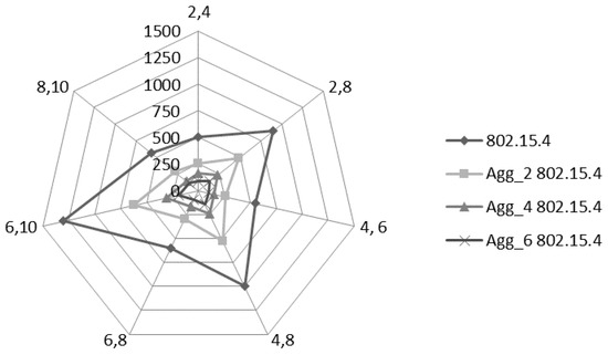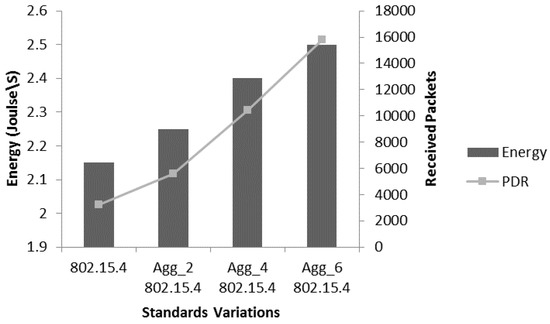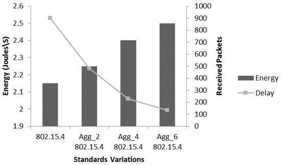 Figure 10 provides the received packets comparative analysis of 802.15.4 with the aggregated-802.15.4. The focus of evaluation is to explore the capacity of different level of aggregations. In the simulation, for aggregated-802.15.4, we used different frame levels including Agg_2 802.15.4 (two frames in an A-MPDU), Agg_4 802.15.4 (four frames in an A-MPDU) and Agg_6 802.15.4 (six frames in an A-MPDU). The purpose of using different levels of aggregation is to conduct a detailed performance analysis of the aggregation mechanism. As duty cycle (DC) mechanism is an integral part of IEEE 802.15.4 to provide energy efficient data transmission, the duty cycle is [4,31]: