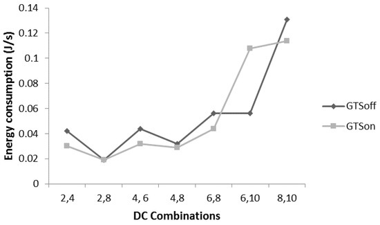 Figure 16 presents the energy consumption analysis for the scenario mentioned in Figure 15. Overall, the GTSon mode provides slightly better energy consumption with the bounded delay. The reason is that the nodes contend for fewer slots in the GTSon mode as compared to the GTSoff mode.