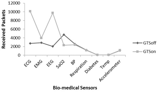 Figure 17, Figure 18 and Figure 19 provide an analysis of received packets for an individual node, that the number of packets received by the coordinator from an individual node. Figure 17 provides a comparative analysis of received packets with GTSon and GTSoff mode. In GTSon mode we assigned 3 GTS slots to ECG sensor and 3 GTS slot to EEG, the remaining seven nodes use slotted CSMA/CA in CAP mode. Figure 17 provides comparative analysis when nodes are 100% active, means with DC value 100%. It is noticed that ECG and EEG nodes provide high packet reception with almost 90% packet delivery ratio in GTSon mode, whereas their performance is low in GTSoff mode. The reason is that these nodes generate many small packets in a limited time and there is no guarantee whether they get a channel access or not as the other nodes are also contending; therefore, the packet lost ratio is high on queues due waiting time and limited space in queues. On the other hand when GTS mode is used for ECG and EEG they provide high number of received packets as in every superframe they get three GTS slots each. It is also noticed that in the hybrid mode (with usage of GTS slots) the node which does not use GTS can provide a lower number of received packets in comparison with a node which only uses slotted CSMA/CA like SpO2 sensor node. The reason for low received packets in the hybrid mode is that superframe is divided in 16 slots, GTS uses six slots (three for ECG and three for EEG) and 10 slots left for seven remaining nodes, these nodes content for the channel and SpO2 gets less number of channel accesses. On the other hand, in non-hybrid mode (all nodes use slotted CSMA/CA for channel access), nine nodes content for all the available slots, where SpO2 gets more slots than in the hybrid mode. The other remaining sensors including BP, respiration, diabetes, temp and accelerometer are sending data at low rate, therefore there is no critical issue involve with them.