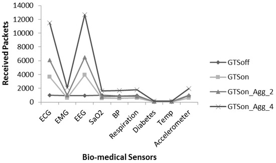 To overcome the issue presented in Figure 18, we apply the frame aggregation mechanism. Figure 19 provides comparative analysis of received packets of individual sensors under four modes i.e., GTSoff, GTSon, GTSon_Agg_2 and GTSon_Agg_4. Moreover, the DC mechanism is considered with the value of 25%. It is noted that the frame aggregation mechanism increases the number of received packets significantly for each node.