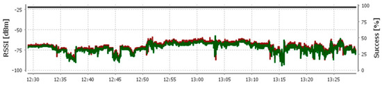 It is observed that there is some interference in the form of variations in RSSI values on a single channel due to human movement; however, it does not significantly affect the packet reception ratio (success [%]).