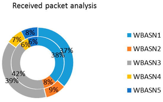 The coordinator nodes can communicate to each other as well as with the central node. Moreover, the coordinator node can be used as a data forwarding node towards the central server. Figure 21 shows the scenario where coordinators of each WBASN communicate with the central server. Figure 22 shows received packet analysis at the central server/coordinator. The inner circle represents the aggregation mechanism at Agg_4, whereas the outer circle represents Agg_2. WBASN1 and WBASN3 have more data to send. Due to aggregation mechanism at the MAC layer, they get more percentage as explained earlier. WBASN3 and WBASN4 send 1/4th of data traffic as compared to WBASN1 and WBASN3. It is noticed that WBASN3 and WBASN4 packet reception is better than Agg_2 than Agg_4. The reason for this is their slow traffic generation rate.