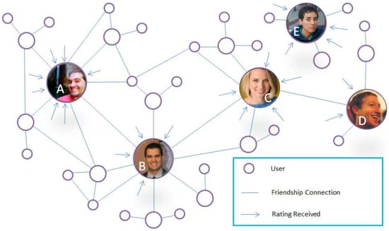 The social network is shown as a directed weighted graph , where represents the set of users of the network, and if is adjacent to , which corresponds to being a friend of .