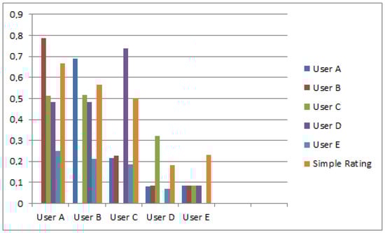 The proposed system is fully dynamic and depends on the relationships between each pair of users. Figure 3 shows a comparison between the trust rates of each pair of users and the classical simple rating used in other proposals that are based only on ratings received from users.