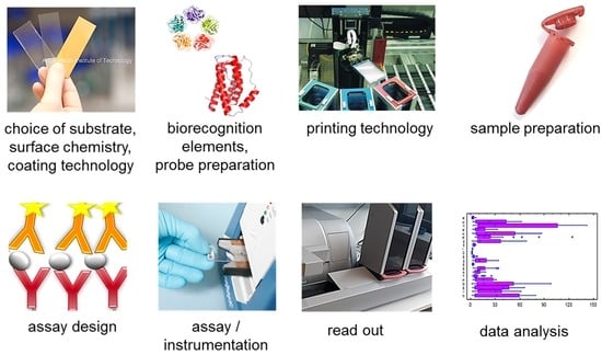 Components of protein microarray production and processing. Work flow from left to right: Preparation of the immobilization surface, probe preparation, printing, sample preparation, assay design, instrumentation, read-out and data analysis.