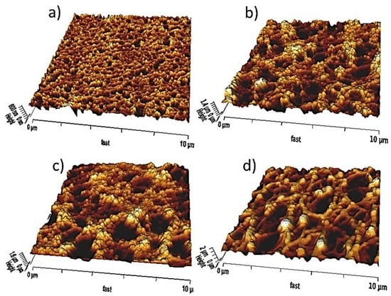 Microarrays require surfaces to be biocompatible and rich in binding sites. The choice of the surface chemistry is governed by some technology inherent requirements such as low background (for fluorescence read out that means low autofluorescence at the excitation wavelength), low unspecific binding (often referred to as antifouling properties); providing good stability, and accessibility of the probes. Last but not least, it depends on the solid support which is often glass, plastic, silicon dioxide or gold. Hydrogels [,], gel pads [], and particularly nitrocellulose [] are popular 3D substrates for protein microarrays. In Figure 2. Atomic Force Microscopy (AFM) images of four commercial nitrocellulose slides for protein adsorption with varying thickness, roughness and pore size are depicted, autofluorescence and binding site density for instance have to be considered before use. BREs can also be entrapped in transparent porous sol-gels, protecting and stabilizing them, given that the sol-gel preparation is modified to be biocompatible (i.e., reduced alcohol content and introduction of appropriate buffers). Sol–gel immobilized biomolecules are reported to retain their structural integrity and biological activity [].