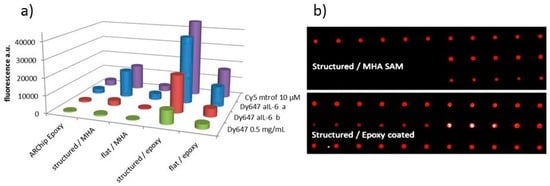 (a) Comparison of the fluorescence signals originating from spotted biomolecules labelled with fluorescent dyes on ARChip Epoxy (glass) and flat and structured gold substrates coated with mercaptohexadecanoic acid/carbodiimide (MHA/EDC) or epoxy resin Epikote 157; (b) Example of microarray image scan comparing the two covalent binding chemistries on a nanostructured gold chip. Ursula Sauer, unpublished results.