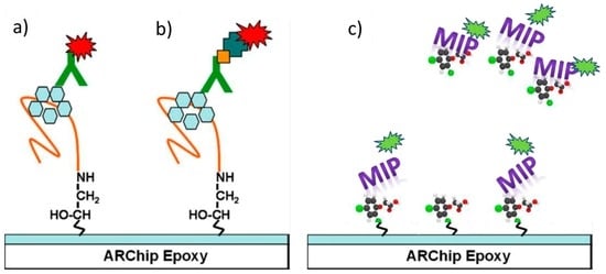 The detection of small molecules is particularly challenging. The size of the molecules hampers sandwich immunoassays, only binding inhibition or competitive assays are possible. As a consequence immobilization of target molecules is necessary in a way providing good accessibility for the detection antibodies. This task has been accomplished by coating conjugates of small molecules with big proteins, e.g., bovine serum albumin (BSA), human serum albumin (has), horseradish peroxidase (HRP), keyhole limpet hemocyanin (KLH) etc. [,]. Another way to present molecules on a surface is to either coat them onto microparticles which are then arrayed onto the chip [], entrap them in sol-gels [] or other porous materials, immobilization onto dendrimers [,] or polymer brushes [,].
