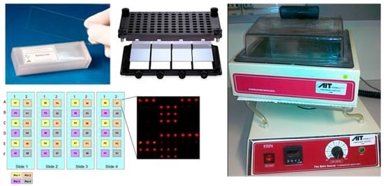 Protein microarray in a standard glass slide format, using hybridization frames (ArrayIt, Sunnyvale, CA, USA) to create up to 14 single incubation wells per slide. A four-slide set can be used for a 9-point standard curve and nine patient samples in one experiment. On the right hand side an orbital shaker with temperature controlled water bath is shown (IBI Scientific, Kapp Court Peosta, IA, USA).