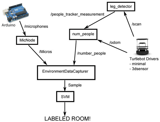 - EnvironmentDataCapturer node: This node receives data samples of noise and movement of people and handles and merges both data in a synchronous sample. This sample is stored in a file to train the support vector machine or it can be sent to a trained SVM to classify a room.