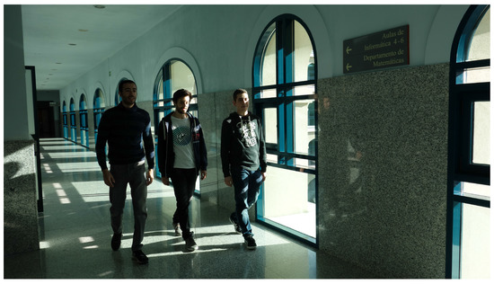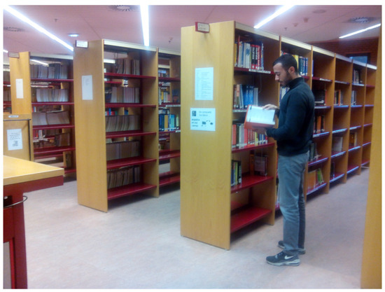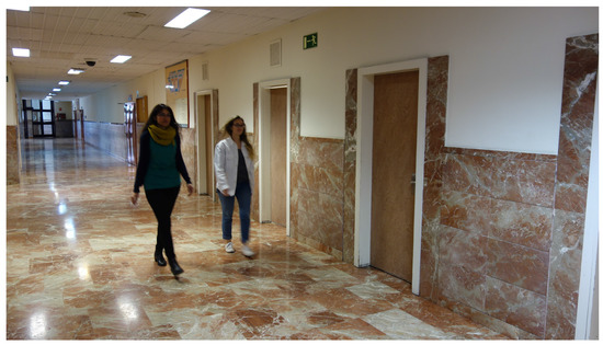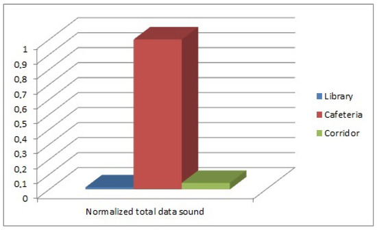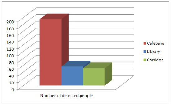- Library vs. cafeteria:The first aim is to ensure that a trained robotic system can differentiate room types with the sensory information available. It is considered that the interpretation of the information is focused on deducing what people are doing in the room. Deducing what people are exactly doing is difficult, but realizing that what people do is different in one place and another is easier. The first test was designed to check that very different places were well labeled. The chosen places were the library and the cafeteria. They are places where people do different things. This is observed in what the sensory system perceived: noise level and the amount of people displacement. Intuitively, a cafeteria is louder, and there are more people per square meter. In a library environment, sound is lower; usually, there is more space between persons, and people move less. Even if a person crosses in front of the sensor, it is estimated that his/her speed will be lower. The results about differentiating these two types of places is reflected in Table 1, which shows that 96.8% of samples were correctly classified. Therefore, 97.22% of library samples and 96.29% of cafeteria samples were well classified. This table shows the results of one of the twelve classifiers generated. Table 2 shows the sum of all of the results of the twelve classifiers. Although there are classifiers better than others, all of them offered very good results. The success rate in this experiment was 98.85% of rooms correctly identified. It is a very good result, but in this case, the classifier should work very well because it was the more intuitive case.