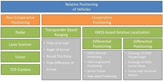 As a first step, in Section 2, the requirements from the applications on vehicle relative positioning systems will be named and quantified. Section 3 gives a comprehensive review on non-cooperative ranging sensors that are already commercially available or currently under research. Then, Section 4 focuses on cooperative approaches for relative vehicle positioning based on the exchange of information between road participants. In Section 5, different approaches of fusing the information of different non-cooperative sensors or coupling the information of both cooperative and non-cooperative solutions are discussed. The Conclusions discusses the different approaches that were presented, synthesizing their advantages and disadvantages.