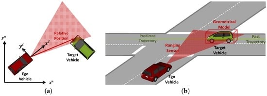 The figure (a) depicts the ego and target vehicle driving in an Earth-fixed navigation frame . A ranging sensor in the ego vehicle is able to detect the target vehicle, whose position is given in an ego vehicle coordinate frame . The figure (b) shows how a geometric model of the target vehicle can be constructed from the ranging sensor measurement data. Using a tracking algorithm, the future location of the target vehicle can be predicted.
