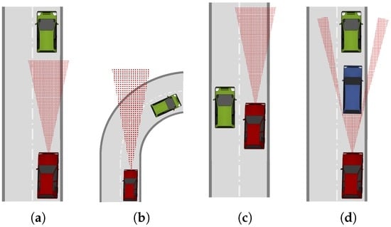 The four figures depict situations where a ranging sensor at the red ego vehicle has a limited performance in estimating the relative position of the green target vehicle. Either because of a limited sensing area in terms of range (a), or aperture (b,c), or due to an obstacle that blocks the line-of-sight (d).