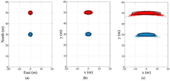 Cooperative approaches are mainly based on GNSS positioning information, which is always referenced to an Earth-fixed coordinate frame. Ranging sensors, on the contrary, output the relative position information of another vehicle in an ego vehicle reference frame. Since the ego vehicle motion control is also executed in this frame, it makes sense to translate the relative position of other vehicles from the Earth-fixed frame to the ego vehicle reference frame when using a cooperative approach. When considering a two-dimensional relative position and two vehicles driving on the same plane, the ego vehicle’s heading is required to rotate the absolute position of the target vehicle into the ego vehicle’s reference frame. This is displayed in Figure 4 for two target vehicles located at a 30 (blue) and a 50 (red) distance in front of the ego vehicle, respectively. Figure 4a shows the relative positions in an east-north coordinate frame with an estimation error of 0.5 (). Figure 4b,c show the relative position in the ego vehicle reference frame after a rotation with the ego vehicle heading angle, which has an error of 1° and 5°, respectively. A higher relative position uncertainty is the result after performing the coordinate frame translation.