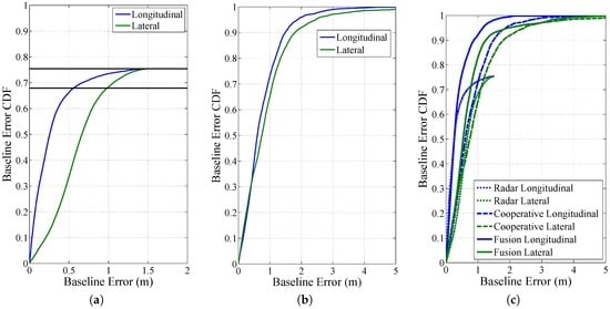 In general, the accuracy of a measurement system could be defined as “how close” the measurement is to its true value. This closeness is quantified by the distance between the measured and true value. In positioning systems, accuracy is usually given in three dimensions. Especially in applications where the vertical position is less relevant, as in vehicular applications where cars drive on roads, the 2D accuracy is used instead. Position accuracy is usually quantified by the Root Mean Squared Error (RMSE) or other conventions as the 95% confidence interval. When evaluating the accuracy of relative positioning systems for vehicles, it is common to differentiate between along-track and across-track accuracy. Especially in on-board ranging sensors, a differentiation between range accuracy and angular accuracy is made. Along with the relative position and relative velocity, it is useful for driver assistance applications to have information about the current uncertainty in each of the measurements. Sensor systems might have different precisions depending on the range towards the target vehicle, the view angle, the material the target is made of or the environmental conditions. A relative positioning system would ideally provide a highly accurate and bias-free relative position and relative velocity output in both the along- and across-track direction along with a measure of the current uncertainty of its estimation. Shladover and Tan stated that 1 position accuracy could be marginally acceptable for collision warning applications, while 50 would yield significantly better results [].
