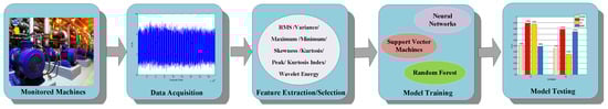 During recent years, machine monitoring systems, including diagnosis and prognosis approaches, have been actively researched [1,2,3,4]. Diagnosis and prognosis systems focus on the detection of faults after the occurrence of certain faults and predictions of the future working conditions and the Remaining Useful Life (RUL), respectively [5,6,7,8,9,10,11]. The methodologies behind these existing machine monitoring systems can be divided into two major categories: physics-based and data-driven models [12,13]. In physics-based models, domain knowledge of physical models and laws with measured data are incorporated into a model constructed via mathematical equations. Previous proposed models, including the Paris crack growth model [14], the Forman crack growth model [15], and so on, all belong to physics-based ones. However, the physics-based models have been criticized for these following points. Firstly, the performance of physics-based models is heavily dependent on the quality and accuracy of domain knowledge about the practical mechanical systems. In real life, due to complexity and noisy working conditions, such a kind of high-quality domain knowledge is often unavailable, which hinders the robustness of these physics-based models. Secondly, most of physics-based models are unable to be updated with on-line measured data, which limits the effectiveness and flexibility of the applications of physics-based models. On the other hand, data-driven models focus on modeling based on historical measured data and try to make a decision from the online data collected from sensors on working machines. Additionally, these model parameters can be updated in real time when the working status of the machines changes. In addition, the development of advanced sensors and computing systems make the research topic of data-driven machine monitoring systems more and more attractive. Therefore, in this paper, our work focuses on this data-driven framework.