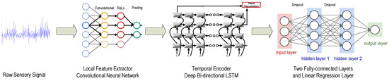 For Layer 1, the input data are the sequence output of the previous CNN model. Additionally, the output of the last LSTM layer at the terminal time step is adopted as the output of our deep bi-directional LSTM. The advantages of stacking of LSTM layers are two-fold. One is that stacking layers enable the model to learn the characteristic of the raw signal at different time scales. The other is that parameters can be distributed over the space, i.e., layers, instead of increasing memory size, which can contribute to more effective non-linear operations of the input raw signal. The architectures of bi-directional LSTMs and deep bi-directional LSTMs are shown in Figure 4b,c.