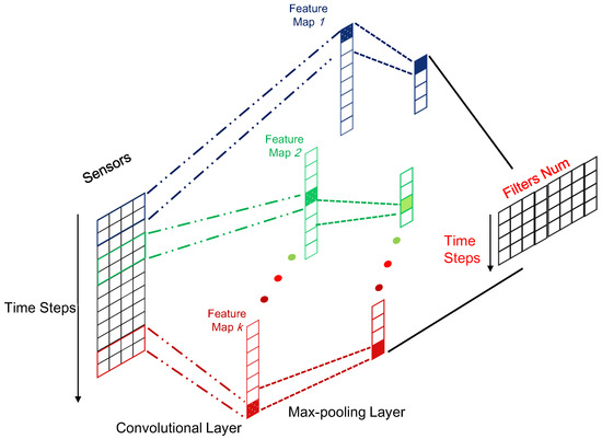 Generally, the size of the input sequence in the CNN layer is , and n is the number of data samples. The size of the corresponding outputs is . It is easily shown that after the convolutional and pooling operation, the length of sequence data can be compressed from l to . Compared to the original representation is raw sensory data with a dimensionality of d that is usually the number of sensors in each time step; more abstract and informative representation can be learned after CNN, and the corresponding dimensionality is k, which is the number of filters. Therefore, CNN plays the role of feature extractor to feed better sequential representation into the subsequent LSTM models compared to the raw sequential data. To give a clear illustration, the framework for the local feature extractor based on CNN has been displayed in Figure 3.