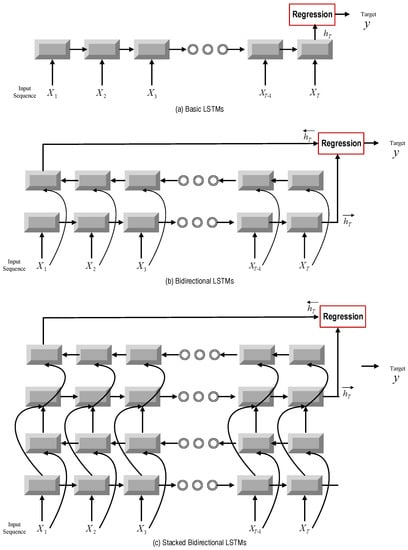 Illustrations for basic LSTMs and the three-layer stacked LSTM model for the sequential data regression problem. The grey blocks denote an LSTM’s layer, while dark red blocks represent a linear regression layer.