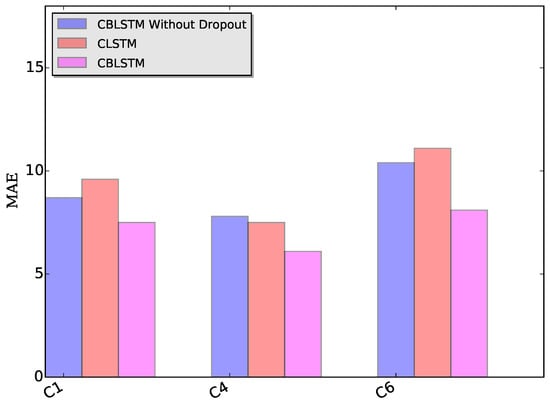 MAE measures of our proposed CBLSTMs without dropout, CLSTM and CBLSTM under three different datasets: C1, C4 and C6, respectively.