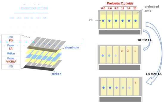 64− oxidation) on the anode. Since increasing amounts of LA were preloaded onto the paper layers of the sensing array, the number of PB spots that changed color at a given time was determined by the concentration of LA in the sample. Higher LA concentration leads to more spots changing color, which enables semiquantitative detection of LA using the naked eye.