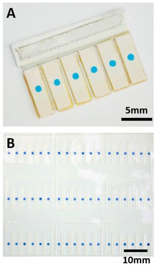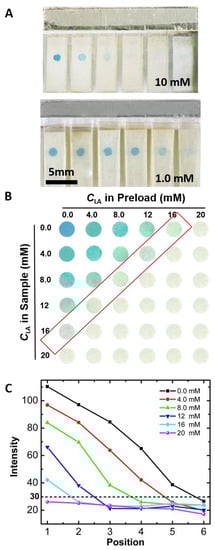 Figure 4A displays the testing results of the electrochromic array after introduction of 18 µL samples containing LA at 10 mM and 1.0 mM, respectively. As we have discussed earlier, the PB spot can be completely converted to PW when the total concentration of LA (preloaded LA plus LA in the sample) was more than 20 mM. When the concentration of LA in the sample was 10 mM, the total concentrations of LA in the sensing array were 10, 14, 18, 22, 26, and 30 mM, respectively. Therefore, the number of cells that underwent color change was three (