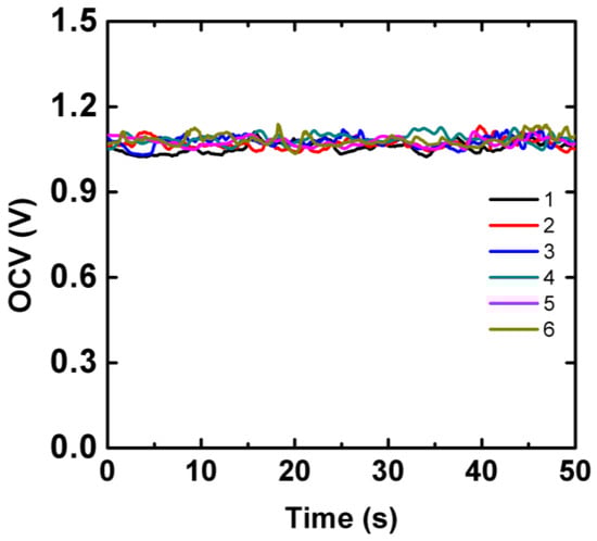 Figure 3, the average OCV of the aluminum-air battery measured from six individual cells was about 1.07 V with a maximum peak-to-peak variation of 70 mV during 50 s.