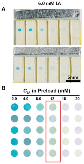 Figure 4B, each row shows the testing result of a sample. From top to bottom, the LA concentrations in the sample were 0.0, 4.0, 8.0, 12, 16, 20 mM, respectively. The testing results can be directly interpreted by the naked eye for semiquantitative detection of LA.
