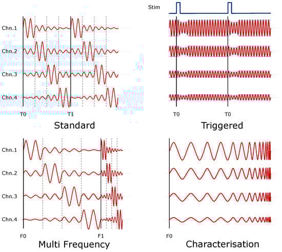 Modes of operation of the ScouseTom EIT system. Standard: Initial dataset collected at time T0, used as reference for subsequent datasets; Triggered: Current continuously injected simultaneous to multiple stimuli, with full dZ signal obtained through coherent averaging; MultiFrequency Data sets collected at multiple frequencies, with initial frequency F0 used as reference for subsequent measurements at higher frequencies; Characterisation Injection frequency is incremented across total range of interest.