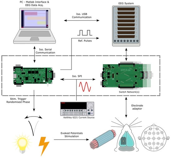 Overview of the ScouseTom system. The two bespoke PCBs (highlighted) control programming of the current source, multiplex the current injection channels and randomise the stimulation trigger with respect to the phase of the injected current. Voltages are recorded in parallel by the EEG system and stored on the PC for offline processing.