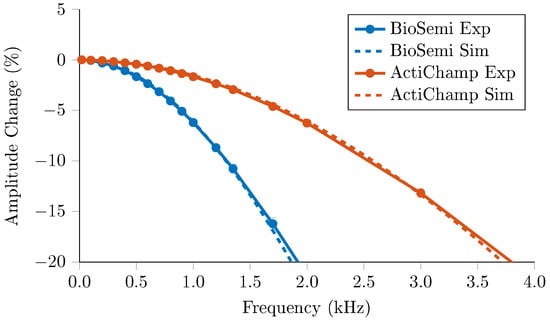 Decrease in amplitude across frequency as recorded with the BioSemi and ActiChamp systems (n = 64 measurements), compared to simulated changes from respective anti-aliasing filters.