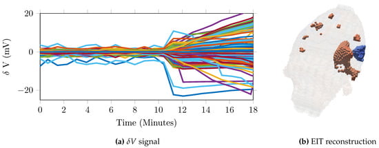 Example result from stroke experiment (a) recorded change in voltages (n = 1381) with haemorrhage onset at T = 10 min, (b) EIT reconstruction at T = 18 min.
