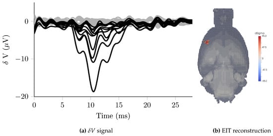 Electrical Impedance Tomography (EIT) is a medical imaging technique which reconstructs the internal conductivity of an object from boundary voltage measurements []. Existing clinical uses of EIT include imaging the lung [], liver [] and breast []; commercial EIT systems are now available for clinical use. EIT of brain function and pathology is another active field of research, with development in applications including epilepsy [,], acute stroke [], traumatic brain injury [,], evoked potentials (EPs) [] and activity in peripheral nerves [].