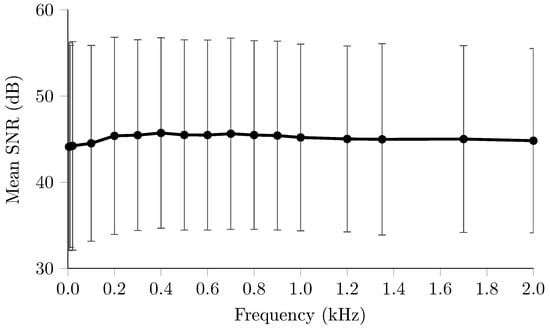 The variation in SNR across frequency, Figure 8, was not significant (), ranging from 44.1 to 45.5 dB. However, the reduction of current amplitude at frequencies below 200 Hz reduced the SNR by 1 dB compared to subsequent frequencies. The longer term recordings also did not demonstrate any significant frequency dependence () in SNR with 41.6 ± 7.9 dB, 41.4 ± 8.25 dB and 40.7 ± 8.2 dB for 0.2, 1.2 and 2 kHz respectively. Similarly the drifts of 0.74%, 0.61%, 0.68% were also not significantly variable across frequency.