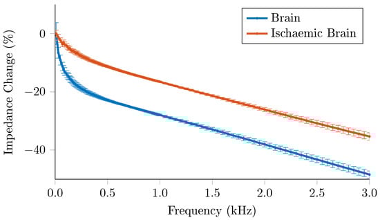 Healthy brain tissue showed a non linear decrease of 15% impedance over 0–250 Hz, with ischaemic brain showing a decrease of 7% over the same range, with a more linear slope Figure 9. Above 250 Hz, the impedance of both tissue types decreased at the same rate.